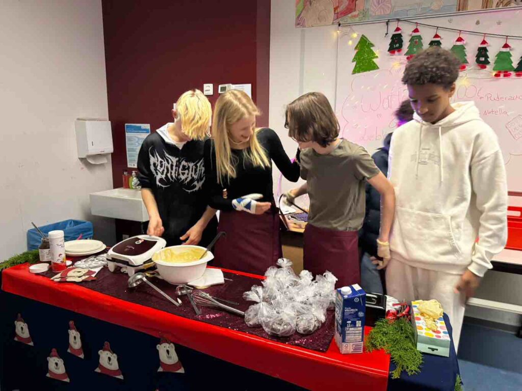 Das diesjährige Winterdorf der Hofecker Mittelschule fand am 4. Dezember statt. Die Klassen, die OGTS, die SMV und der Elternbeirat boten an verschiedenen Ständen in den Klassenzimmern und im Gang selbst produzierte Weihnachtsgeschenke und kulinarische Leckereien an. Auch die Gitarrenklassen, die Schulband „Cubed Music“ und die Theater-AG zeigten ihr Können bei verschiedenen Aufführungen in der Aula. Ergänzt wurde das bunte Programm durch Kinderschminken und unterschiedliche Spieleangebote. So entstand eine fröhliche und gemütliche Atmosphäre, in der Groß und Klein miteinander ins Gespräch kamen und die Vorfreude auf Weihnachten spürbar wurde. Somit konnte die Schulgemeinde der Hofecker Schule abermals ein kurzweiliges Zusammenkommen im Advent genießen.
