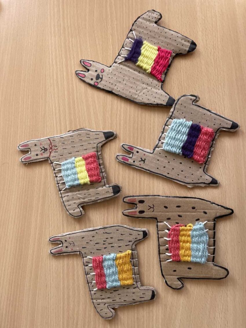 Zuerst haben die Schüler die Alpaka-Schablone auf einen stärkeren Karton übertragen und anschließend mit einer Schere sauber ausgeschnitten. Nachdem die Umrandung, das Gesicht und das Fell auf den Karton gemalt wurde, sind Markierungen für den Kettfaden mit dem Lineal sauber angezeichnet worden. Nach dem Einschneiden des Kartons, wurde der Kettfaden befestigt. Am Ende haben die Schüler mit mindestes drei verschieden bunten Fäden eine Decke für das Alpaka gewebt. Die Schnurenden mussten natürlich auch sauber verknotet und versteckt werden.