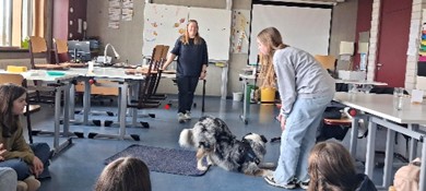 Bei Pizza und Getränken schwelten alle in Erinnerungen als Stella noch ein kleines Fellknäuel gewesen war, wie sie ihre Milchzähnchen verloren hat und nach und nach lernte, dass man weder SchülerInnen, noch Fahrräder, und schon gar nicht Autos hütet. Ein kleiner Film mit Bildern zeigte, wie sie sich körperlich entwickelte und veränderte. Stella ist auf jeden Fall eine absolut menschenfreundliche Hündin geblieben, die es genießt, gestreichelt zu werden und dass selbst auf dem hektischen Pausenhof, der für jeden Hund eine Herausforderung ist. Die wilde Seite zeigt sie nur noch im Spiel mit ihrem Frauchen Frau Pohl, was die meisten dann doch überrascht, wenn sie es sehen. Pubertär wie sie gerade ist, probiert sie schon noch so manche kleine Frechheiten aus, aber Stella ist ja auch immer noch ein junger Hund. Wir machten viele von den fast 30 Tricks, die ich mit Hilfe der Schülerinnen Stella beibrachte.