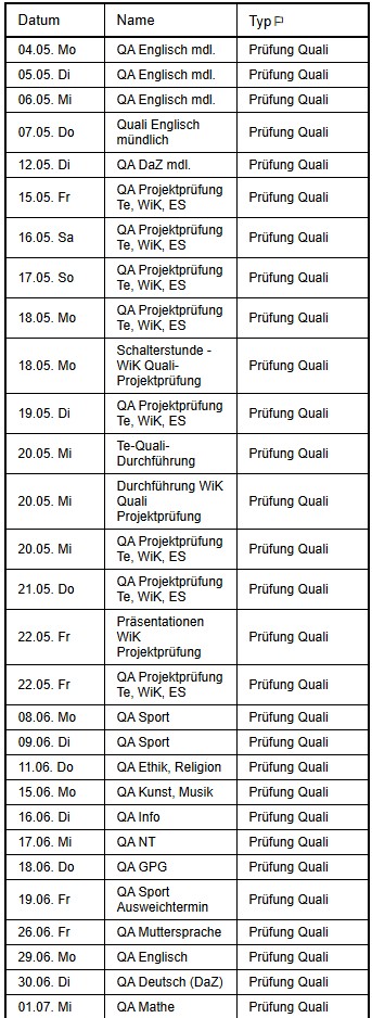 !!! Die Prüfungstermine finden Sie in der Datei. Individuelle Prüfungstermine für DAZ mündlich und Englisch mündlich sowie für die Leittextausgabe der Projektprüfung müssen eine Woche vorher selbst in der Verwaltung der Schule erfragt werden. Dafür können Sie in der Zeit von 8.00 Uhr bis 13.00 Uhr anrufen. Alle schriftlichen Termine beginnen 8.00 Uhr. !!!