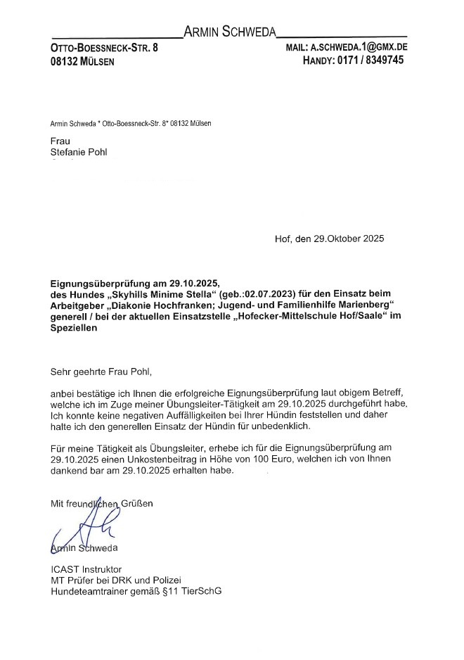 In der Vergangenheit hat uns bereits Louie, ein Labrador-Rüde, begleitet. Aktuell unterstützt uns Stella. Sie befindet sich derzeit noch in der Ausbildung. Natürlich achten wir bei unseren Schulhunden auf die notwendigen Voraussetzungen, Untersuchungen und Ausbildungen, damit sie ihre Aufgabe bei uns erfüllen können.